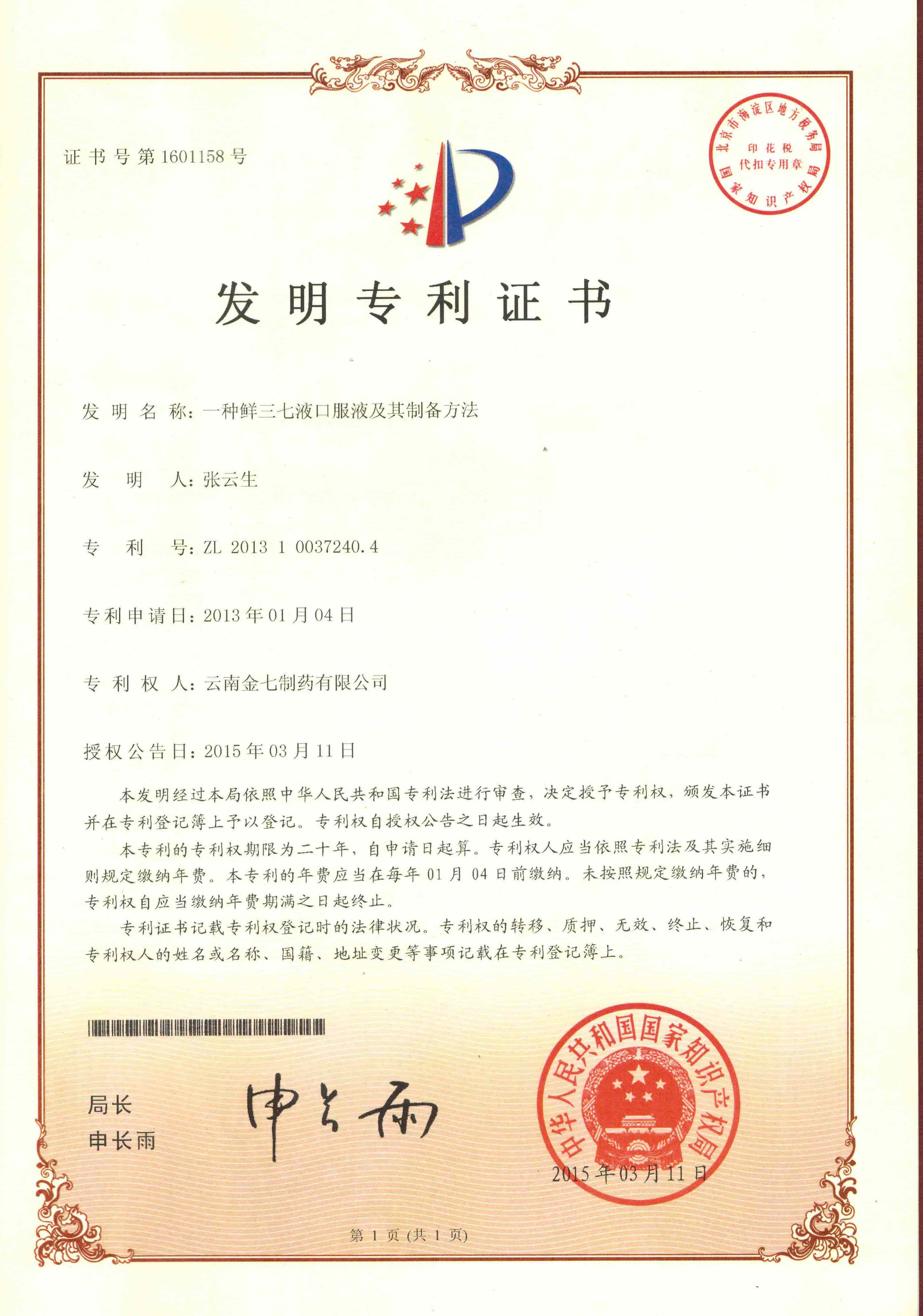 一種鮮三七液口服液及其制備方法專利號: ZL2013 1 0037240.4